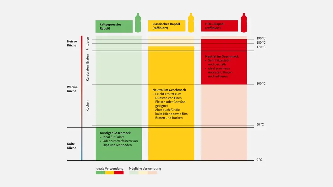 Für die kalte Küche empfehlen Kochexperten das kaltgepresste Rapsöl zu verwenden. Für die warme Küche wird die Verwendung von klassischem Rapsöl empfohlen. Und fürs Anbraten, Braten und Fritieren greifen Sie idealerweise zum HOLL-Rapsöl. -